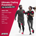 - Prevents chafing Prevents pain All day protection Contains Aloe & Shea Butter Use less get more! Made in the USA