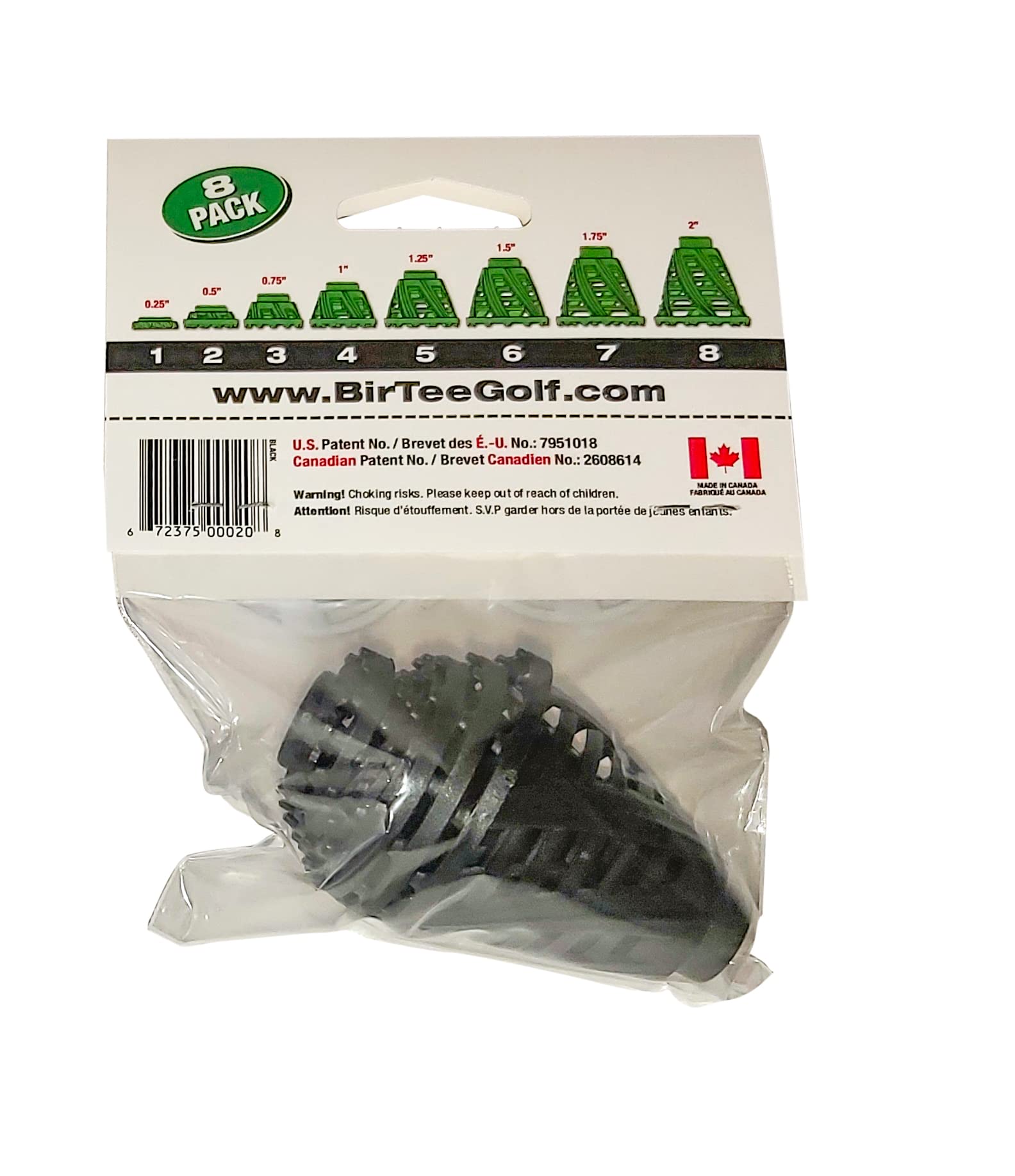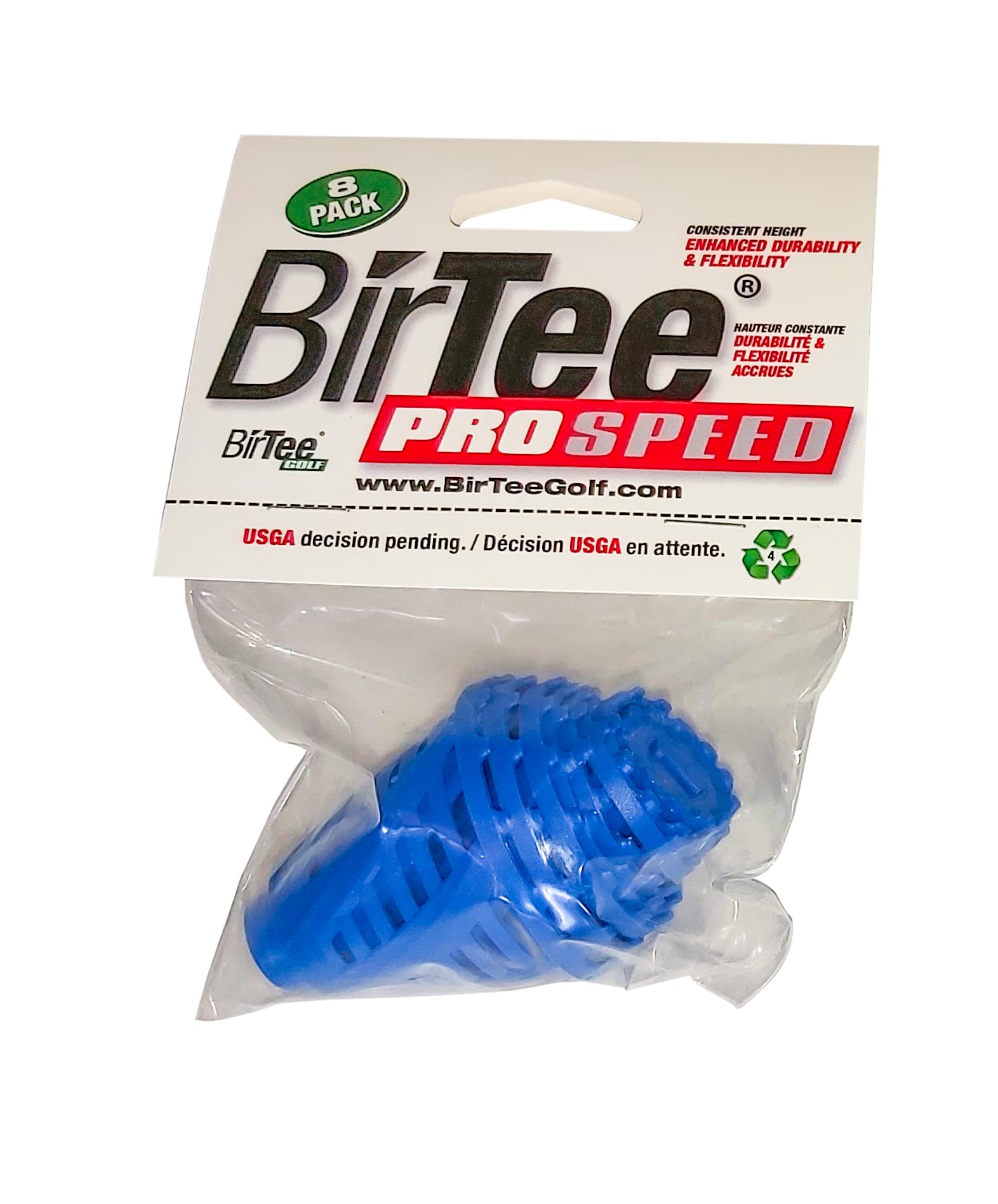 The new PRO SPEED version of the original revolutionary BIRTEE PRO golf tees, designed to be fast and easy to use for golfers of all calibres and ages.This new design has 6 larger legs as opposed to 12 smaller legs, for enhanced Flexibility & Durability. Also the upper part of the legs come together sooner in a reinforced solid section attaching it to the ball support, for greater durability. They also feature a better quality, more flexible and more durable plastic, which has lowered the brittleness temperature, for better results for extremely cold temperatures for winter golf. The kit comes complete with 8 tees varying in height from 1/4" up to 2" with 1/4" incremental steps. It provides every golfer with a constant height for any size club (Drivers, Woods, Hybrids & Irons) for every tee shot. They are also available in Individual Sizes Packs. The BIRTEE PRO works on normal golf surfaces, as well as on any hard surface such as gym / garage floors, indoor GOLF SIMULATORS and even frozen ground. It was designed to be reusable, durable, recyclable and more convenient than conventional tees. It eliminates the need for pushing tees into the ground, but most importantly it eliminates the guess work for achieving a constant tee height. The 8 constant heights will give every golfer more confidence and consistency.