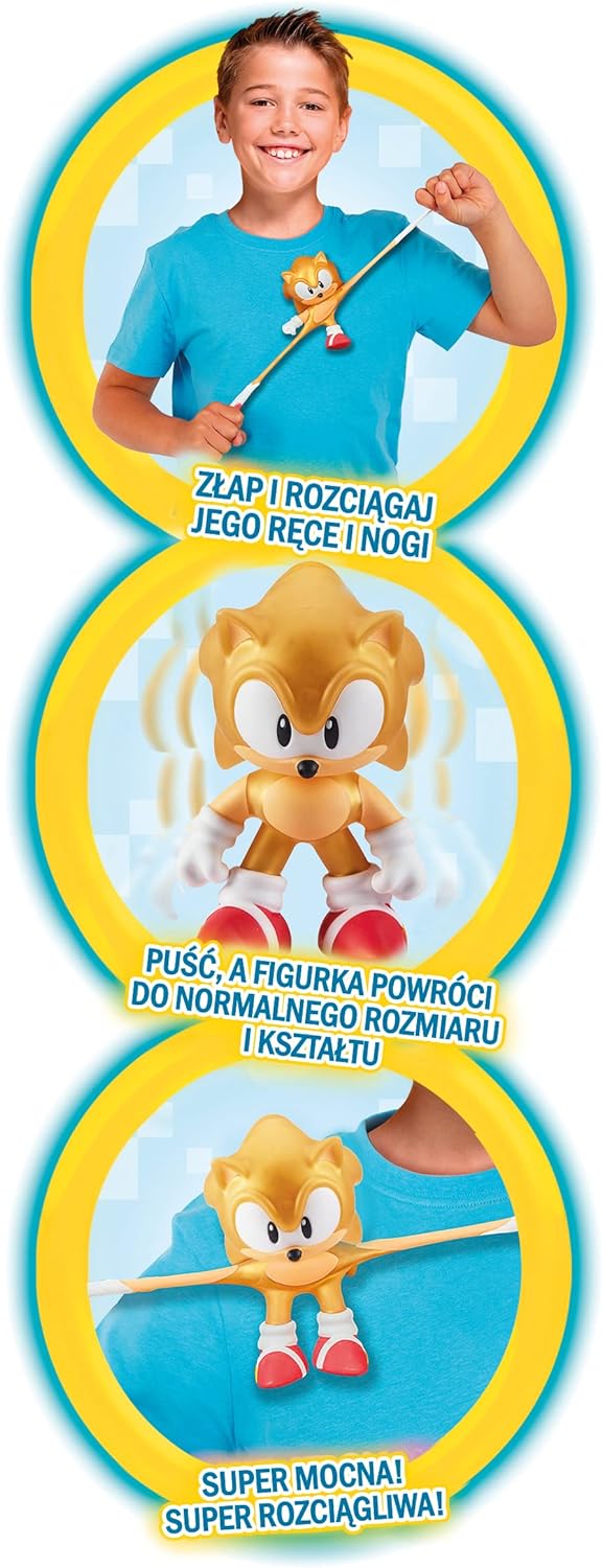 Checkout the awesome gold Stretch Sonic the Hedgehog. He's not just supersonic, he's Super Stretchy. Filled with special gold rings and a super stretchy golden filling. Sonic has jumped out of the screen and into Someone's hands to become super stretchy. Squeeze, stretch and play with him like never before. Grab him by his limbs and stretch out his arms and legs. Wow. He can stretch up to 3 times his size. Let him go and watch him return to his good shape and size. Discover a new way to play and help Sonic save the day.