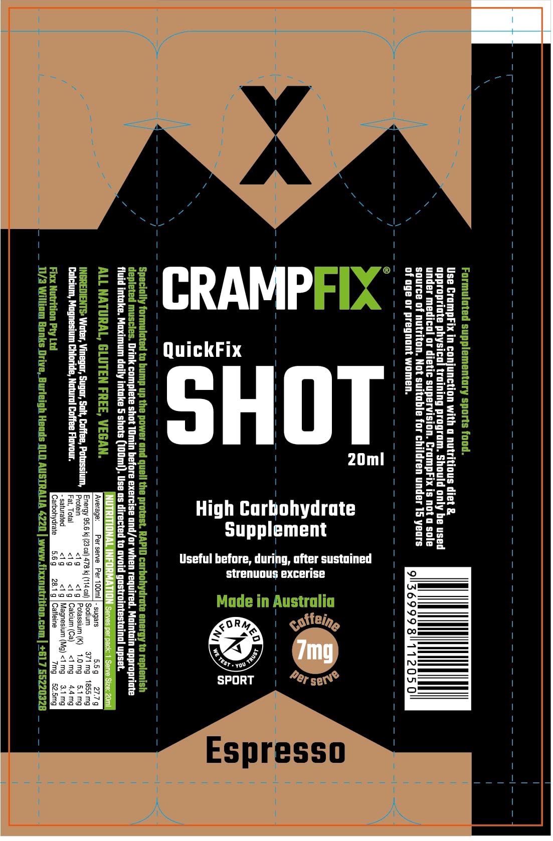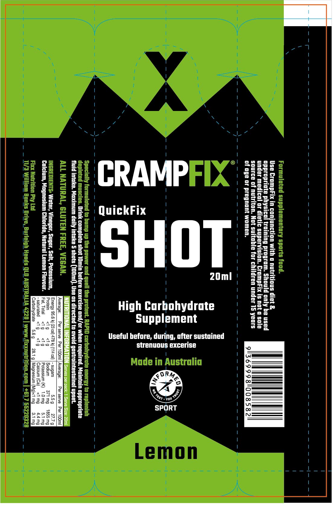 CrampFix contains a proprietary blend of Water, vinegar, sugar, salt, potassium (K), calcium (Ca), magnesium chloride, and natural lemon flavour. It is not intended to replace water, carbohydrate or electrolyte supplements; rather it is used to improve the way these necessities are utilised during moderate and high intensity exercise.