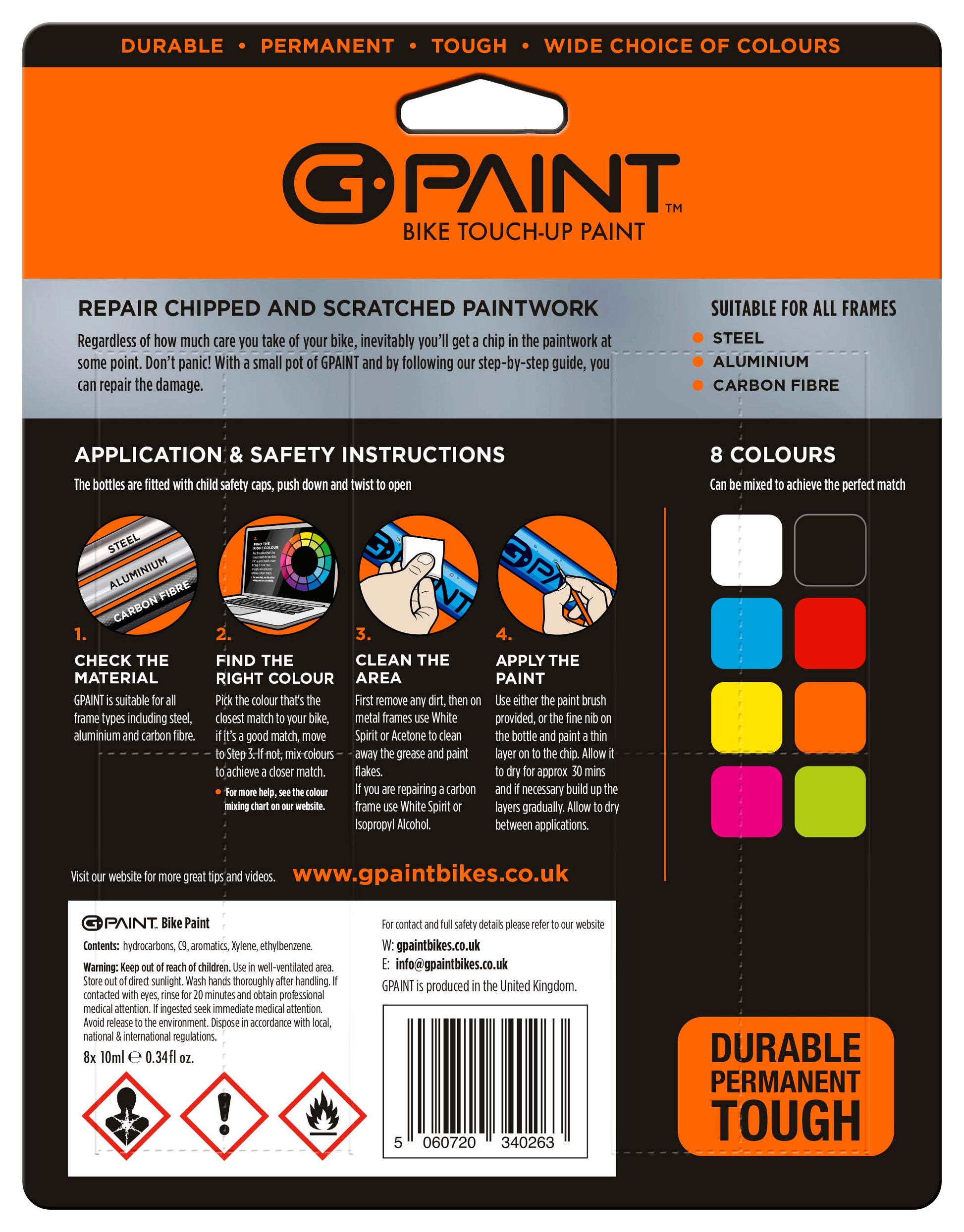 - G-Paint bike touch-up paint is perfect for touching up scratched and chipped paintwork on your bike / cycle frame. Suitable for either flat or custom colours.