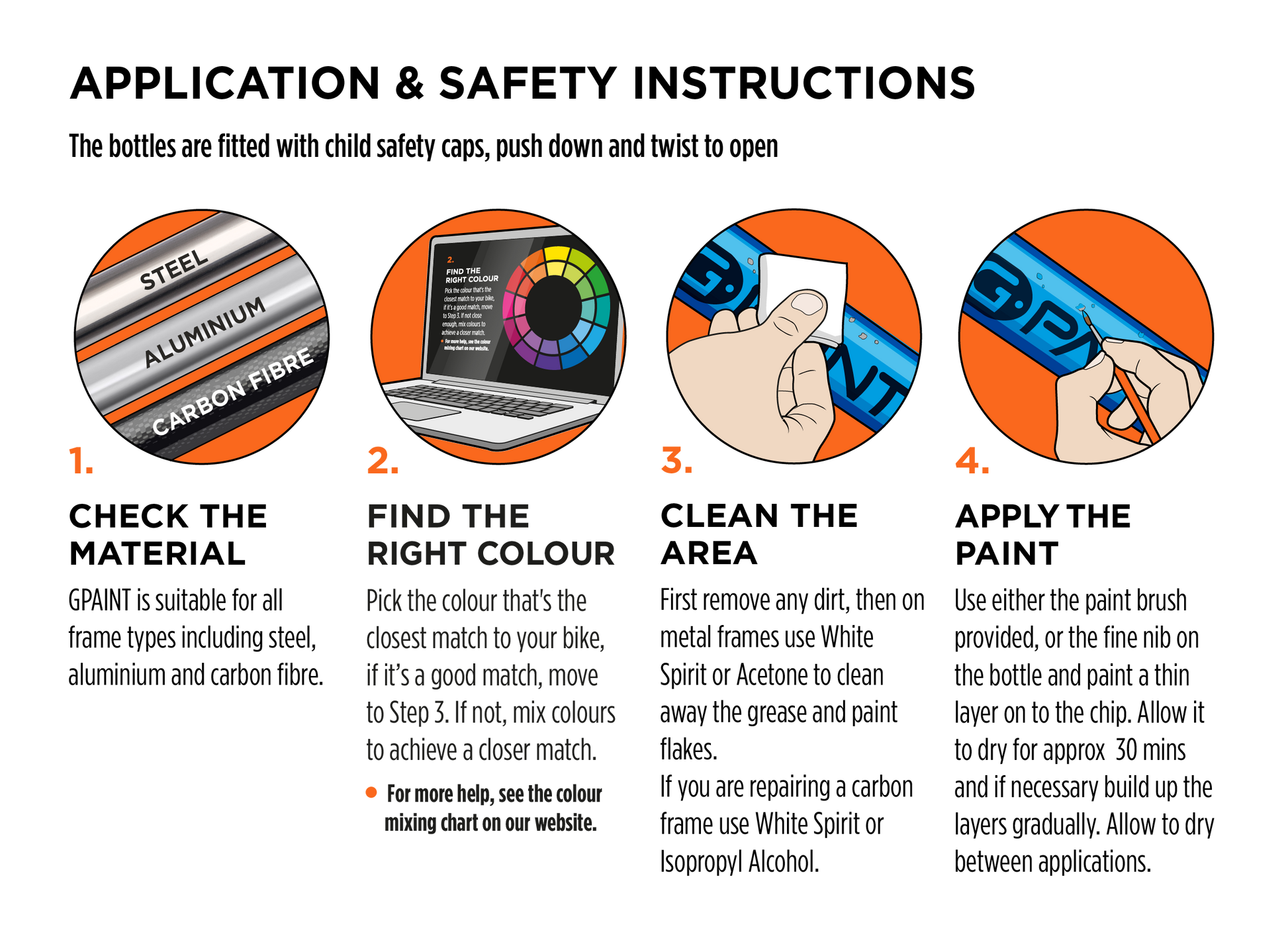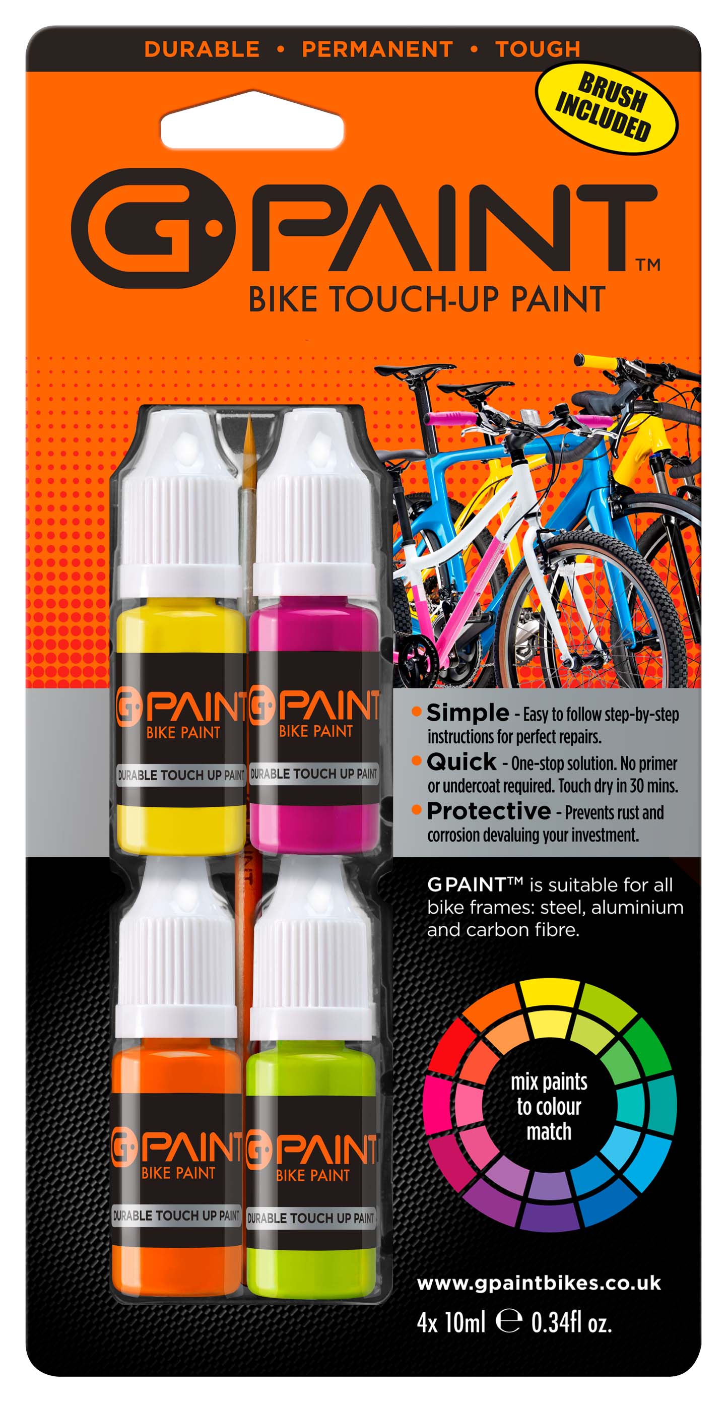 - Pack contains 4 x 10ml touch up paint bottles. Each bottle has its own fine nib applicator and a child-proof safety cap. Includes a brush, making painting your bike frame quick and easy.