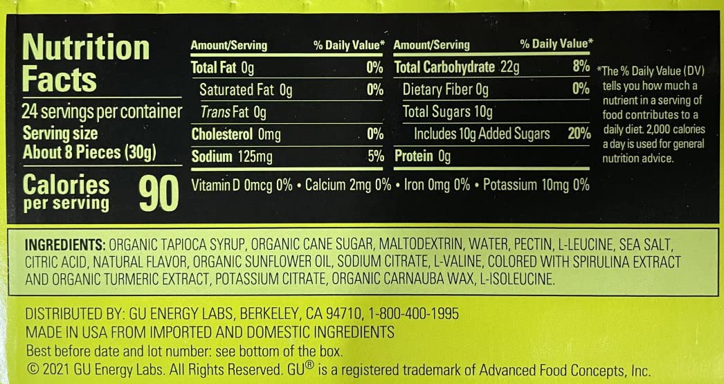 To avoid fatigue while exercising, you need a portable source of easily digestible carbohydrates to fuel your muscles. GU Energy Chews pack energy-dense calories to meet the demands of all types of activity and contain carbohydrates (maltodextrin and fructose) that use non-competing pathways that can help maximize absorption, increase carbohydrate utilization, and diminish stomach distress, for energy that kicks in quickly and stays with you. Available in two different packets and sizes to give you more fueling options while you're on the move. GU Energy Chews are crafted to supply both energy and key nutrients like electrolytes and amino acids to keep you feeling strong and energized. Delicious, mouthwatering flavors help you stick to your nutrition plan, so you can keep going. Energy Chews have similar nutrients per serving to the original GU Energy Gels, delivering the energy you need in chewable, bite-sized pieces. GU Energy Chews pack energy-dense calories to help you fuel on-the-go. Each highly portable bag contains sixteen (16) bite-sized Chews, which translates to two (2) servings, making it easier to eat and fuel at your own pace. These mini versions of our Energy Chews also have electrolytes and amino acids to keep you feeling strong. GU Energy Chews contain 90 calories per serving and 40mg of Sodium to help maintain water balance. Assorted pack includes flavors with caffeine. Here’s what’s inside: Carbohydrates (maltodextrin and fructose) that use non-competing pathways that can help maximize absorption, increase carbohydrate utilization, and diminish stomach distress, for energy that kicks in quickly and stays with you. Sodium, the primary electrolyte lost in sweat that aids in hydration by maintaining fluid balance. Branched-chain amino acids (L-Leucine, L-Valine, and L-Isoleucine) which may reduce mental fatigue and decrease muscle damage while jump-starting recovery.
