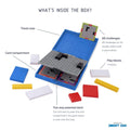 Mondrian Blocks is an award-winning puzzle and travel game. Challenge your flexible thinking and problem-solving skills. The box contains a travel case, 11 blocks and 88 different challenge cards (separated into 4 difficulty levels) in each edition.