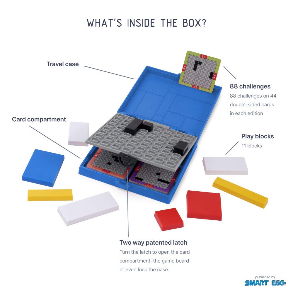 - WHAT YOU GET - Mondrian Blocks is an award-winning puzzle and travel game. Challenge your flexible thinking and problem-solving skills. The box contains a travel case, 11 blocks and 88 different challenge cards (separated into 4 difficulty levels) in each edition. You can get more challenges by registering your product online.