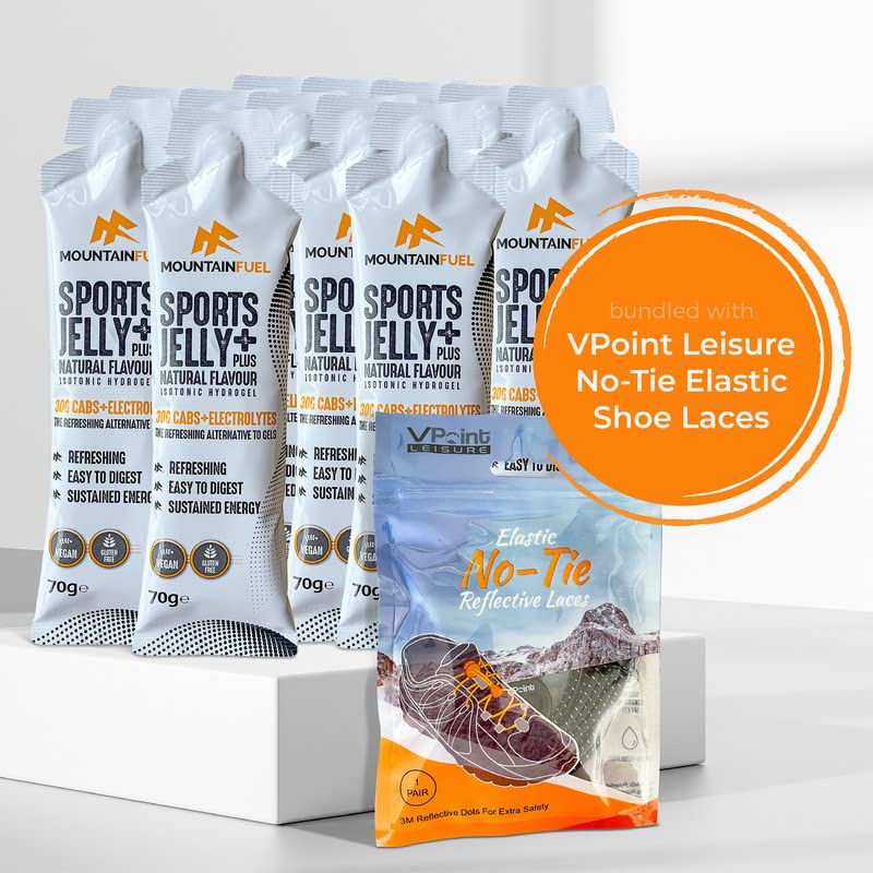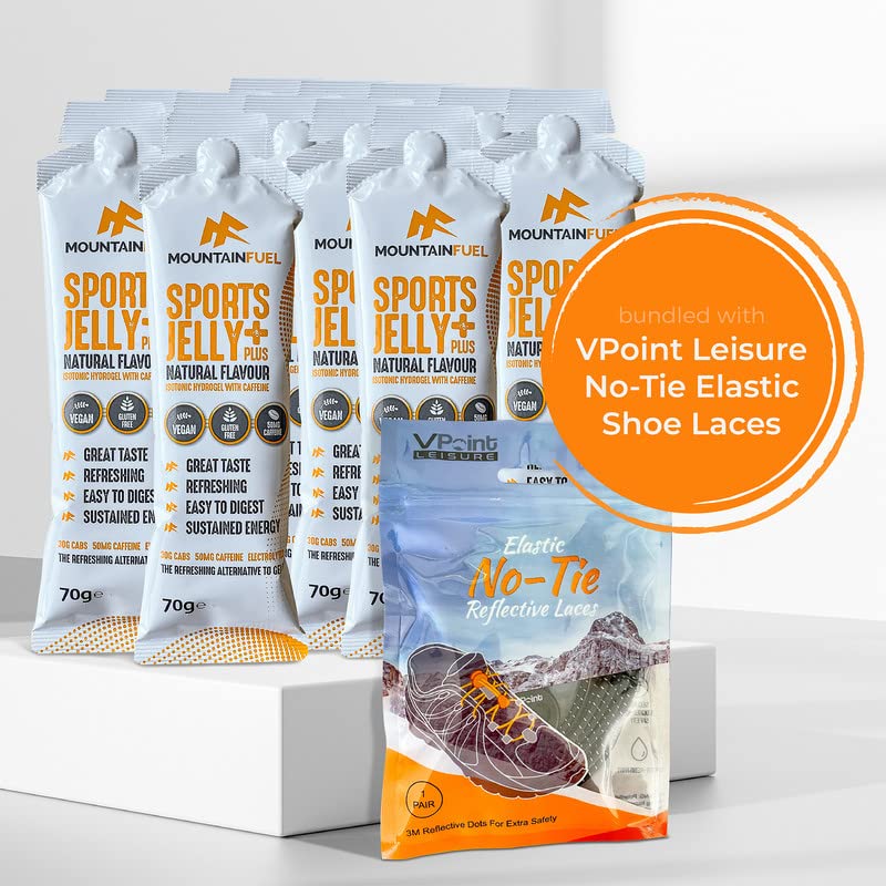 Mountain Fuel Sports Jelly Plus 6 X 50mg Caffeine, 6 X Non-Caffeine Natural Flavour Isotonic Energy Gel Hydration Sachets. Rehydration Energy Gels for Cyclists and Runners. Includes Elastic Shoelaces for Running and Cycling