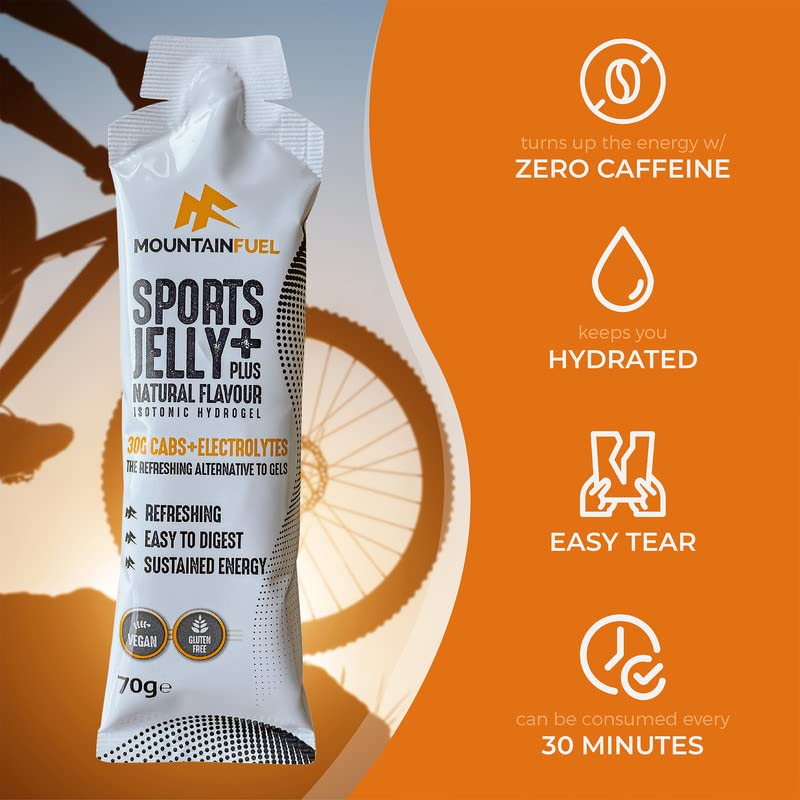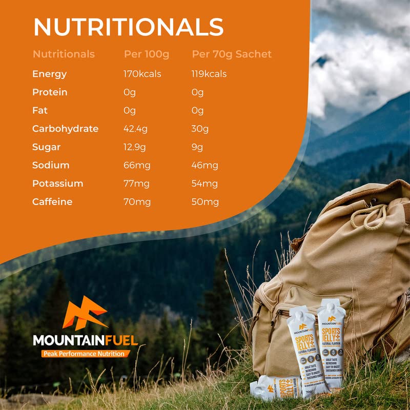 - [Avoid the Gut Bomb] The unique formula of Mountain Fuel Sports Jelly is far easier to digest than any rival running energy gel. No more stomach cramps! And with a natural flavour, you can get your electrolyte and glucose hit without leaving a strange taste in your mouth.