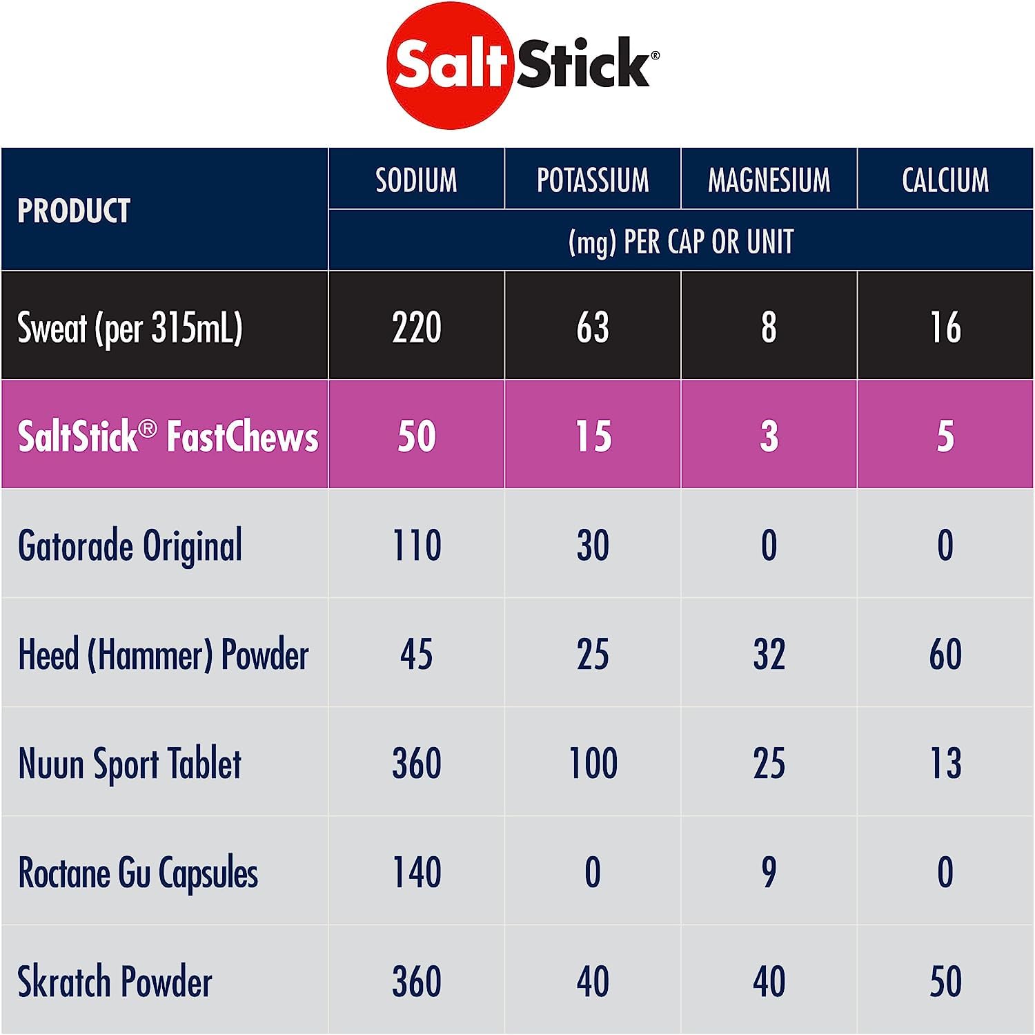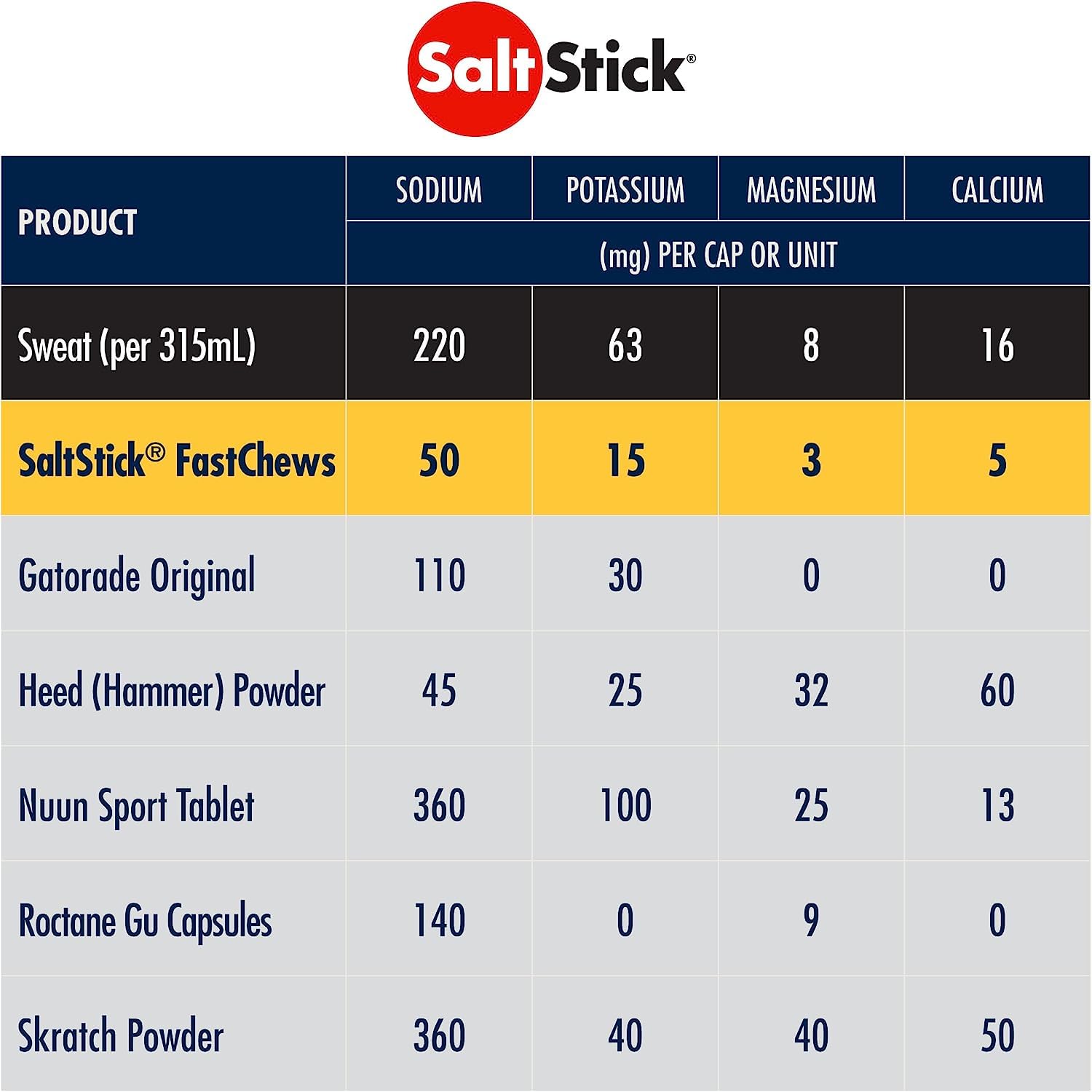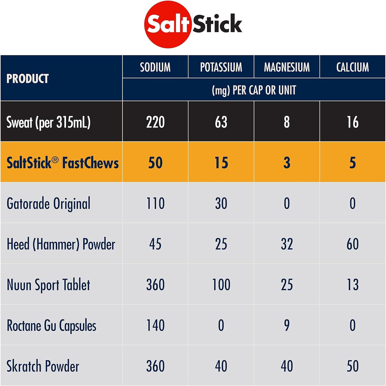 SaltStick FastChews are delicious, chewable tablets that provide a similar ratio of electrolytes to what your body loses through sweat. Our scientific formula relies on cleanly sourced, buffered ingredients to help minimize heat stress and muscle cramping due to dehydration, without causing stomach discomfort. FastChews are ideal for anyone who sweats, including athletes and outdoor workers, or in situations where you need a boost of electrolytes. How do I use them? It's in the name! FastChews are FAST-absorbing electrolytes designed to be CHEWed, not mixed with water. The electrolytes in FastChews are absorbed through the lining of your mouth, which studies have shown to take in nutrients 2-4x faster than the intestines. Chew FastChews or let them dissolve in your mouth; then wait 2-3 minutes before eating or drinking so the electrolytes have time to be absorbed into your bloodstream. How often do I use them? Everyone is different, and your exact electrolyte needs will be based on your bodyweight, genetics, level of fitness, and outdoor temperatures. But in general, we recommend taking 1 FastChew every 15 minutes during exercise if you're consuming a sports drink, or 2 FastChews every 15 minutes if you're consuming plain water.