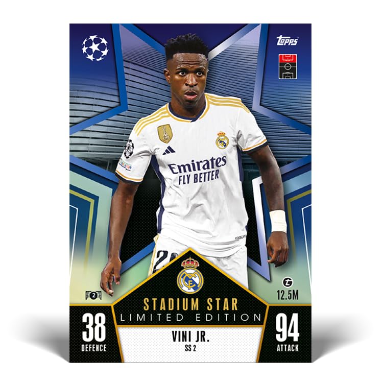 Match Attax returns for the 2023-24 Topps Match Attax UEFA Champions League Cards Stadium Stars Mega Tin and collection, showcasing the best players from the UEFA Champions League, UEFA Europe League and the UEFA Europe Conference League. This incredible new collection features a huge range of cards to collect from Black Edge cards, Blue Crystal Parallel cards, Heritage design cards, Pro Elite Chrome Shield cards and the 100 Club to the amazing NEW Energy cards and all NEW Limited Edition card categories including Gold Rush Ultra, Artists of the Game and Stadium Stars. Look out for Centurion Relic cards and Player-worn Relic cards inside lucky tins, THE ZEN ultimate celebration card inside lucky packets and genuine Autograph cards plus parallels across the collection. #TheChaseIsOn 66 Match Attax cards inside the Mega Tin plus 4 exclusive Stadium Stars Limited Edition cards: Pink #1 - Jack Grealish, Vini Jr., Gianluigi Donnarumma & Rafael Leão Blue #2 - Martin Ødegaard, Manuel Neuer, Marco Reus & Dušan Tadić Green #3 - Marcus Rashford, Gavi, Jamal Musiala & Timo Werner Orange #4 - Bruno Guimarães, Marco Verratti, Joshua Kimmich & Nicolò Barella Look out for rare UCL Centurion or Player-worn Relic cards inside lucky tins (1:28).