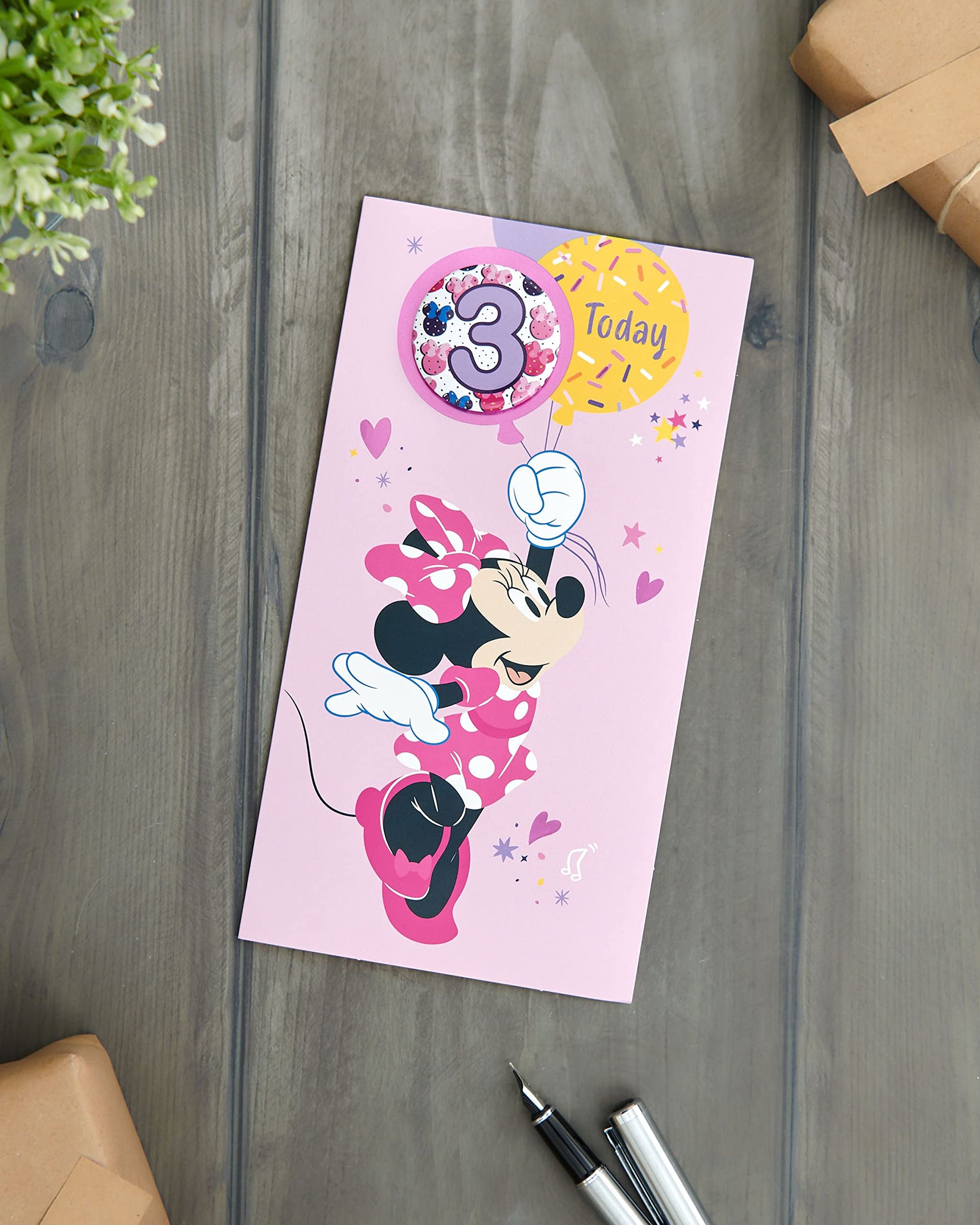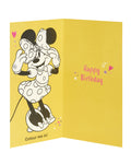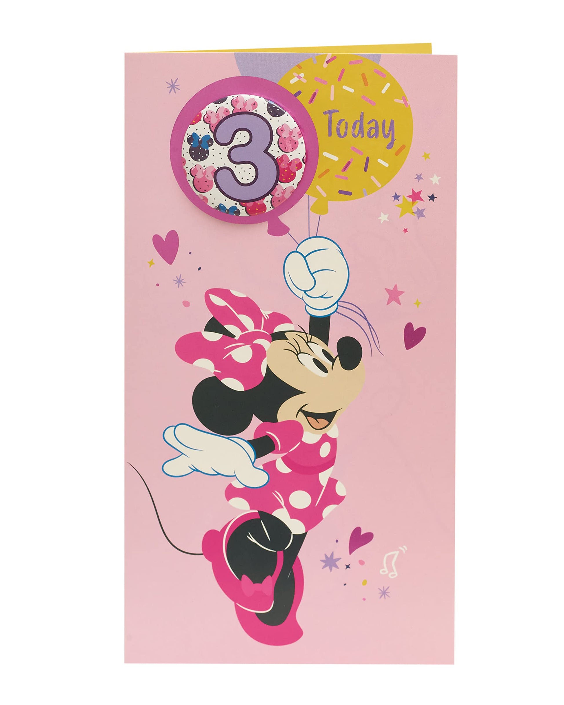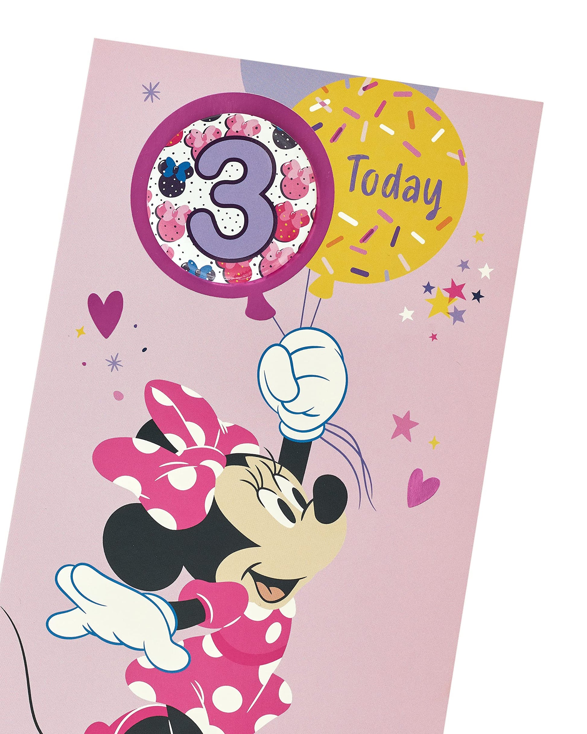 - Yippee! Someone’s turning three! Spoil them with this Disney birthday card featuring Minnie Mouse, which comes with a badge and a Minnie to colour!