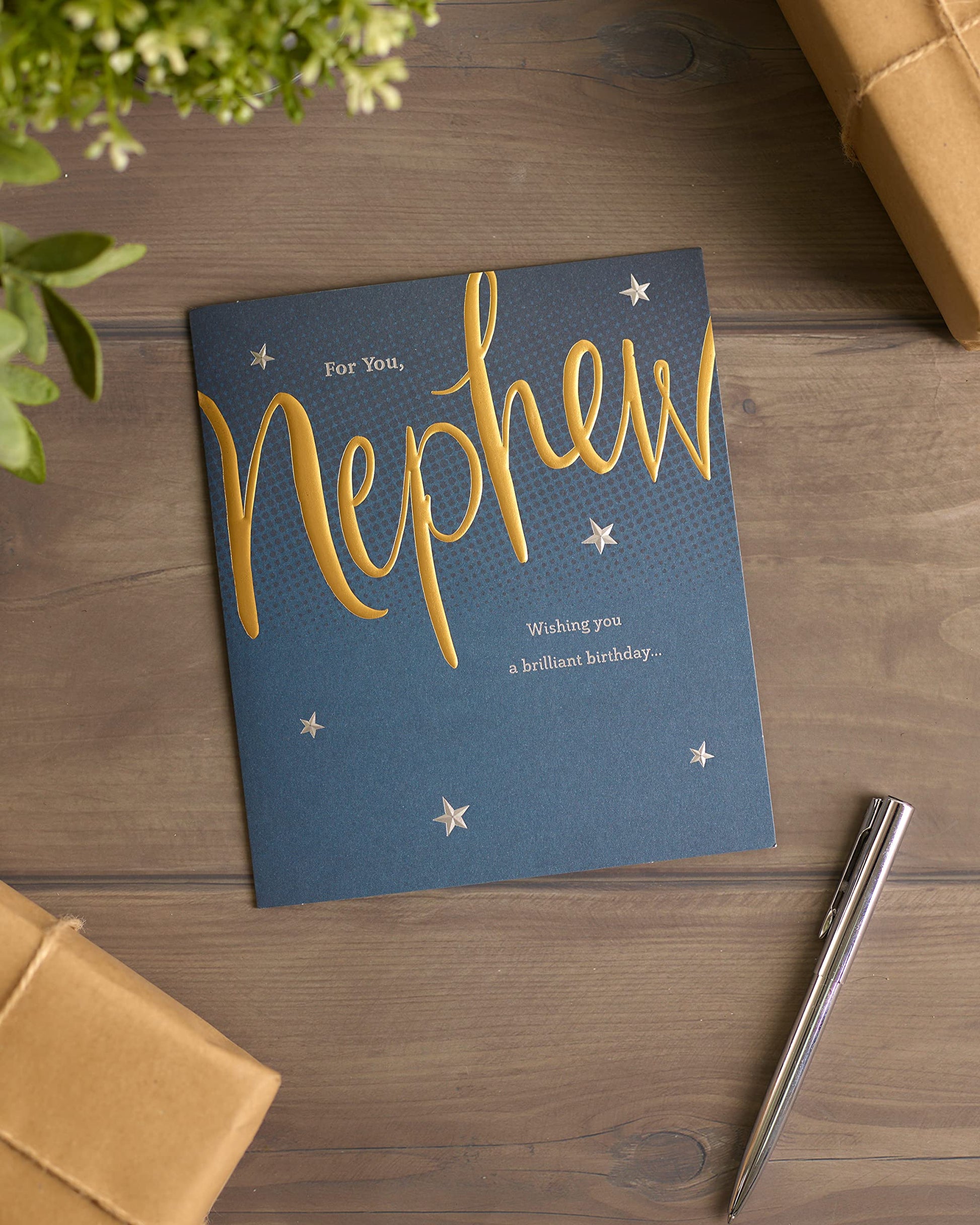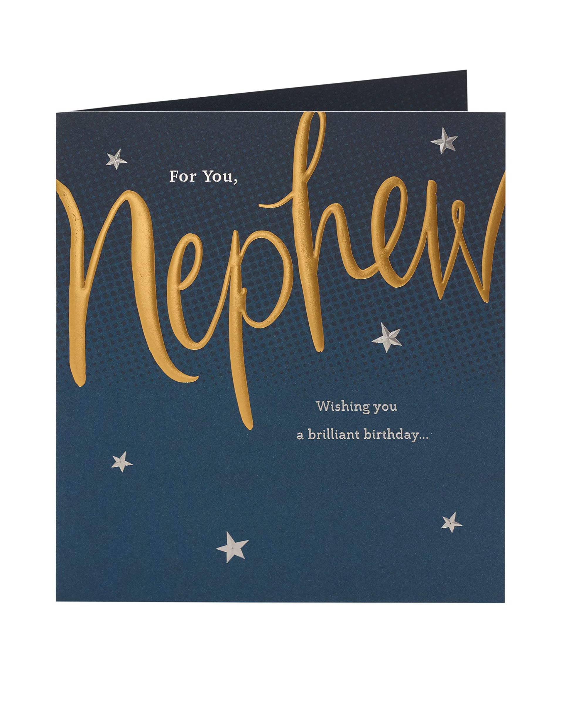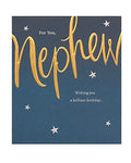 - Wish your special nephew a brilliant birthday with this card, featuring metallic gold and silver foil lettering.